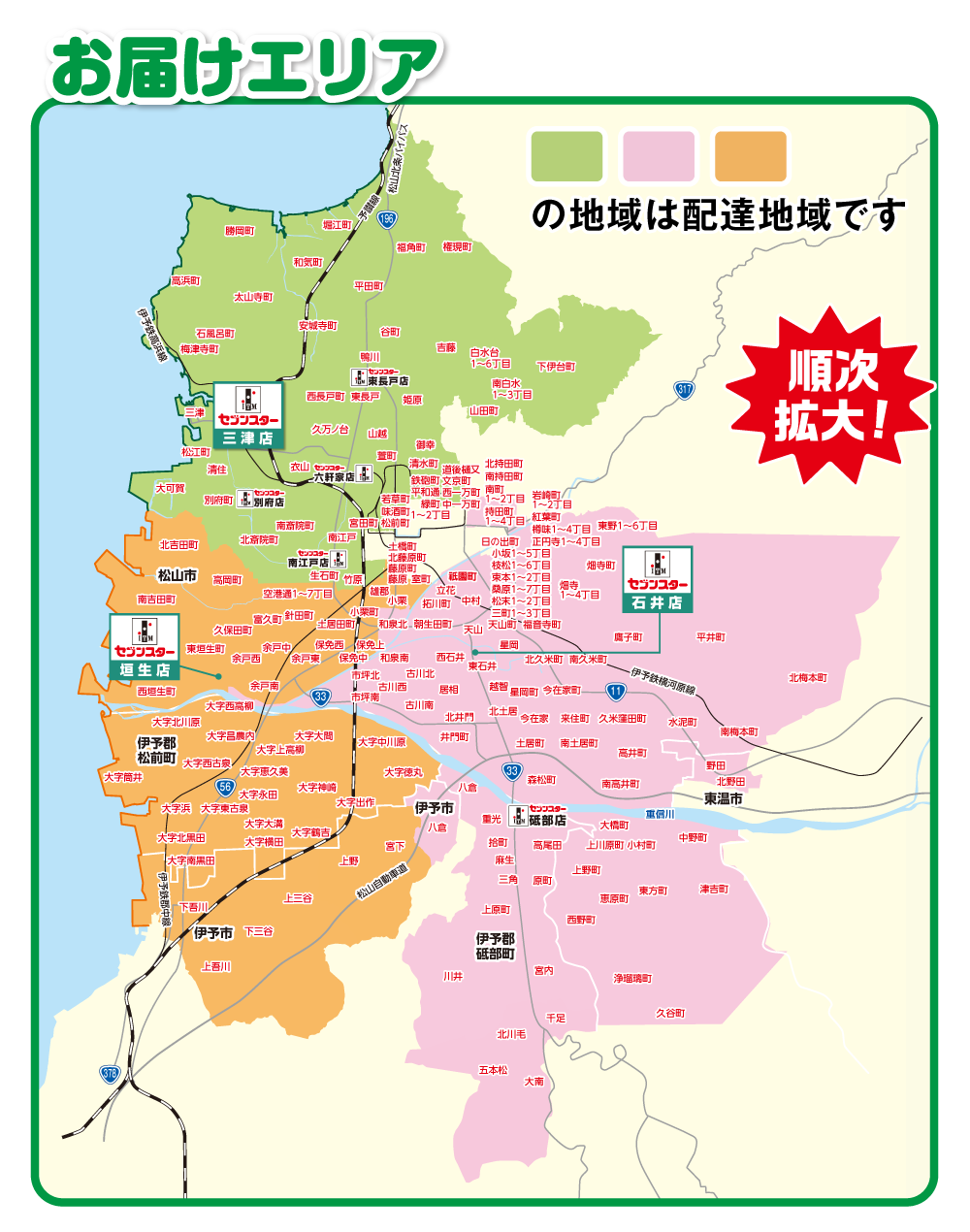 【松山市】東石井1〜7丁目・西石井1〜6丁目・天山町・天山1〜3丁目・朝生田町1〜7丁目・星岡1〜5丁目・星岡町・居相1〜6丁目・越智1〜3丁目・北土居1〜5丁目・土居町・南土居町・北井門1〜5丁目・今在家1〜4丁目・今在家町・古川北1〜4丁目・古川南1〜3丁目・古川西1〜3丁目・和泉北1〜4丁目・和泉南1〜6丁目・福音寺町・北久米町・南久米町・来住町・久米窪田町・高井町・鷹子町・市坪北1〜2丁目・市坪南1〜3丁目・中村1〜5丁目・立花1〜6丁目・祇園町・拓川町・平井町・水泥町・北梅本町・南梅本町・井門町・森松町・南高井町・大橋町・上野町・上川原町・小村町・中野町・東方町・津吉町・西野町・恵原町・浄瑠璃町・久谷町・三町1〜3丁目・松末1〜2丁目・枝松1〜6丁目・小坂1〜5丁目・畑寺町・桑原1〜7丁目・束本1〜2丁目・畑寺1〜4丁目・樽味1〜4丁目・正円寺1〜4丁目・紅葉町・日の出町・岩崎町1〜2丁目・東野1〜6丁目・南持田町・北持田町・持田町1〜4丁目・南町1〜2丁目